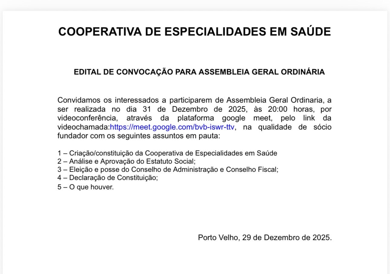 Convidamos os interessados a participarem de Assembleia Geral Ordinaria, a ser realizada no dia 31 de Dezembro de 2025, às 20:00 horas, por videoconferência, através da plataforma google meet, pelo link da videochamada: https://meet.google.com/bvb-iswr-ttv , na qualidade de sócio fundador com os seguintes assuntos em pauta:
