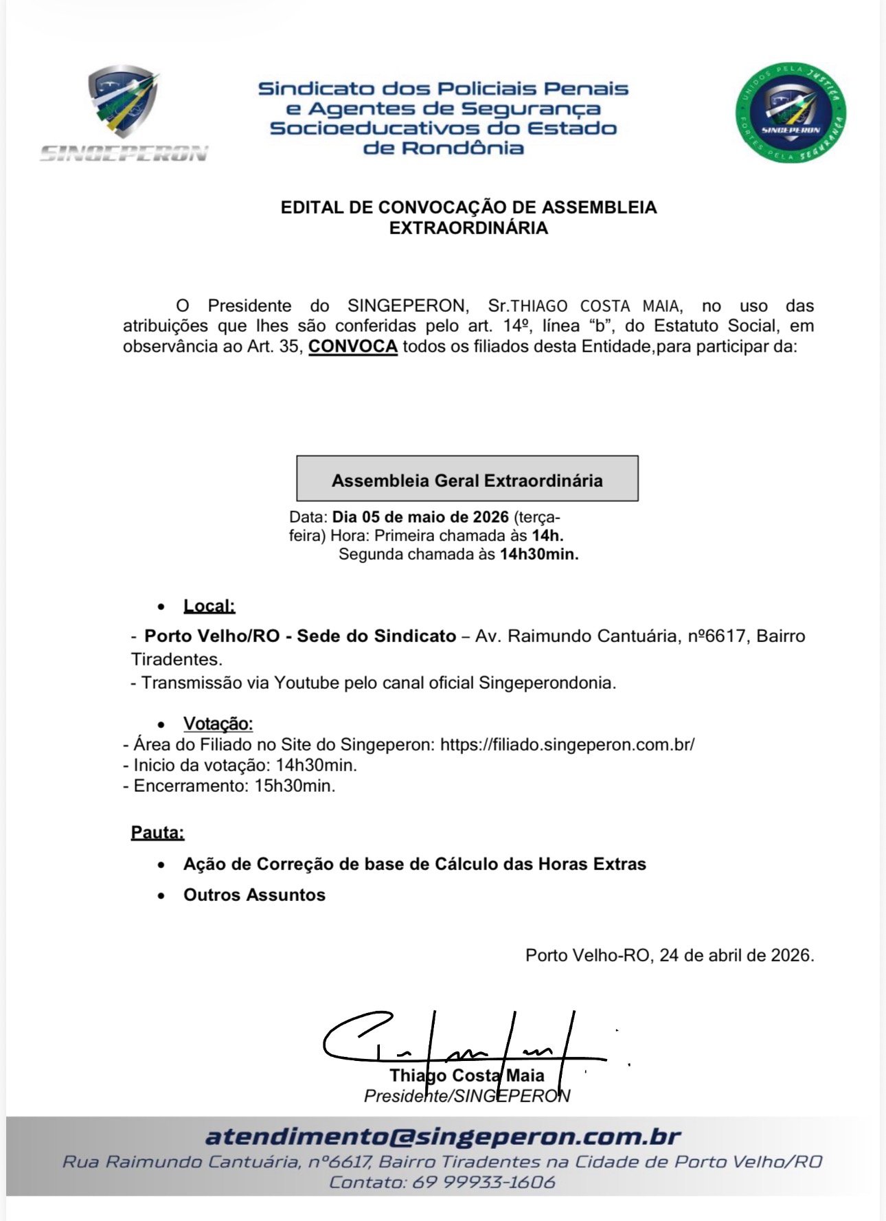 O Sindicato dos Policiais Penais e Agentes de Segurança Socioeducativos do Estado de Rondônia (SINGEPERON) publicou edital convocando todos os seus filiados para participação em Assembleia Geral Extraordinária, que será realizada no dia 5 de maio de 2026, em Porto Velho.