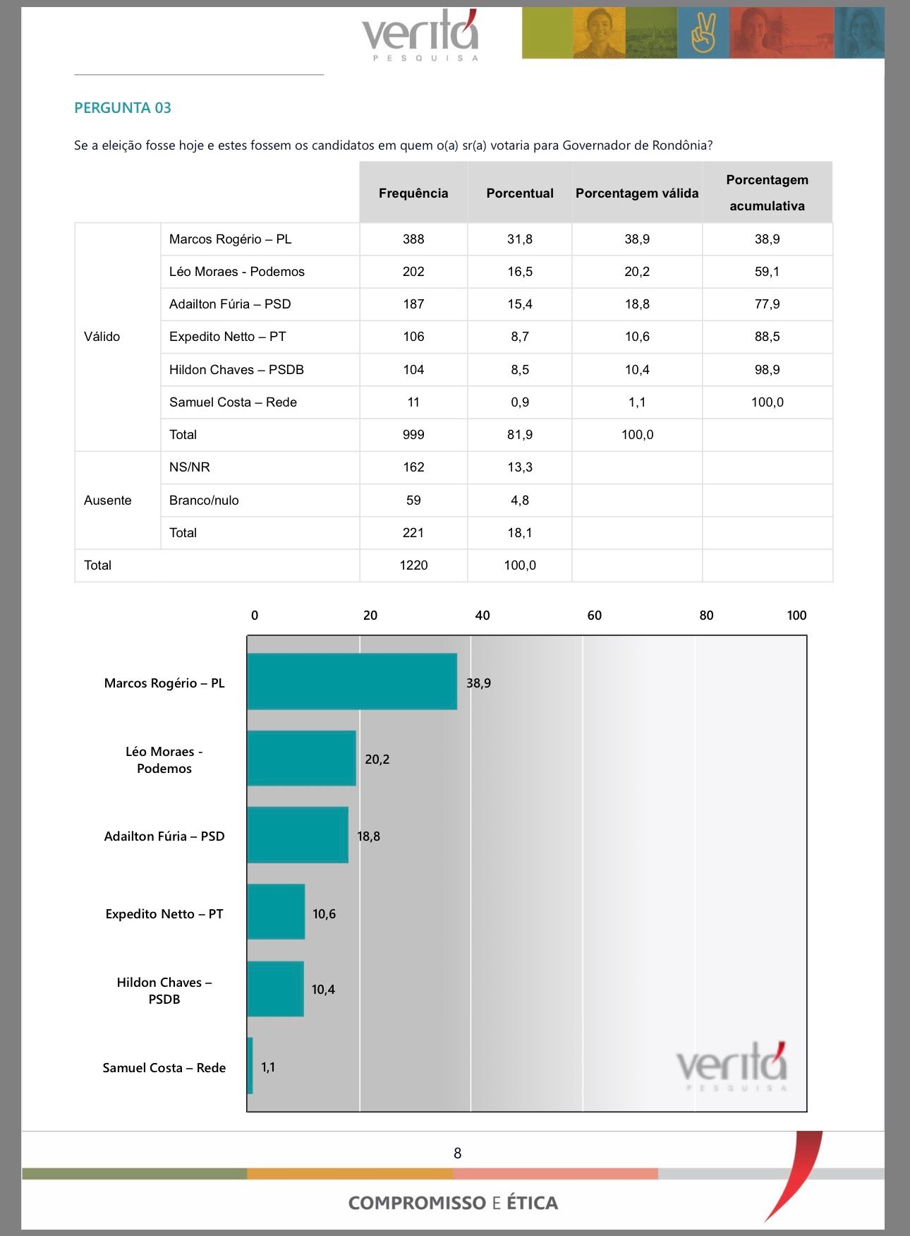 Na sequência aparecem Léo Moraes, com 20,2%, e Adailton Fúria, com 18,8%, formando um segundo pelotão ainda distante do líder.