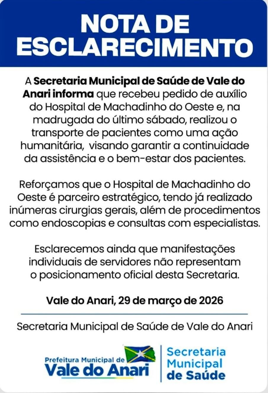 A Secretaria Municipal de Saúde de Vale do Anari divulgou uma nota de esclarecimento informando que prestou apoio ao Hospital de Machadinho do Oeste após receber um pedido de auxílio. De acordo com o comunicado, na madrugada do último sábado foi realizado o transporte de pacientes como uma ação humanitária, com o objetivo de garantir a continuidade da assistência e o bem-estar dos atendidos.
